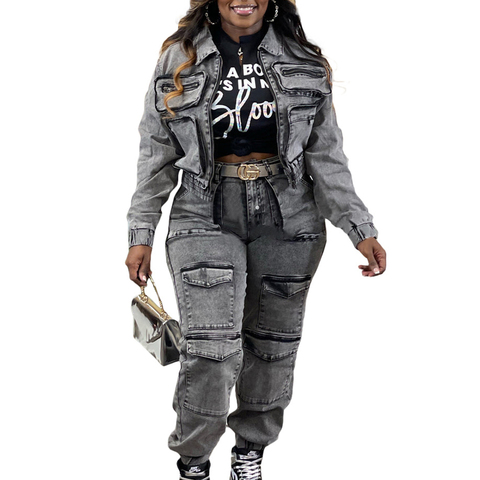 Benutzer definierte Farbe Cargo Pocket Bomber jacke Frauen High Stretch Washed Denim Cargo Top und Hose Casual Zweiteiliges Set