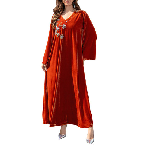 ชุดเดรสมุสลิมของผู้หญิงชุดเดรสยาวสีแดงติดเพชรหรูหราสำหรับฤดูใบไม้ร่วงและฤดูหนาวของอิรัก
